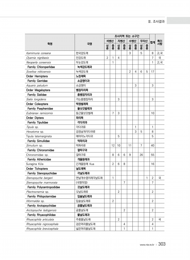 Ⅱ. 조사결과 www.nie.re.kr ? 303 학명 국명 조사지역 또는 소구간 합계 특이 사항 석병산 자병산 수병산 두타산 상류 중류 상류 중류 상류 중류 상류 중류 Kamimuria coreana 한국강도래 3 5 8 고,국 Oyamia nigribasis 진강도래 2 1 4 7 국 Neoperla coreensis 두눈강도래 1 1 고,국 Family Chloroperlidae 녹색강도래과 Sweltsa nikkoensis 녹색강도래 2 4 6 5 17 Order Hemiptera 노린재목 Family Gerridae 소금쟁이과 Aquaris paludum 소금쟁이 3 3 Order Megaloptera 뱀잠자리목 Family Sialidae 좀뱀잠자리과 Sialis longidens 가는좀뱀잠자리 ...