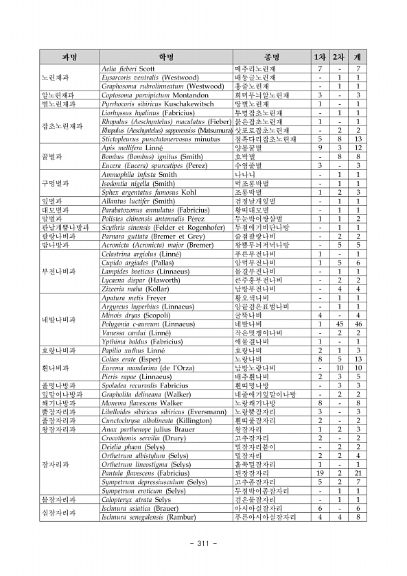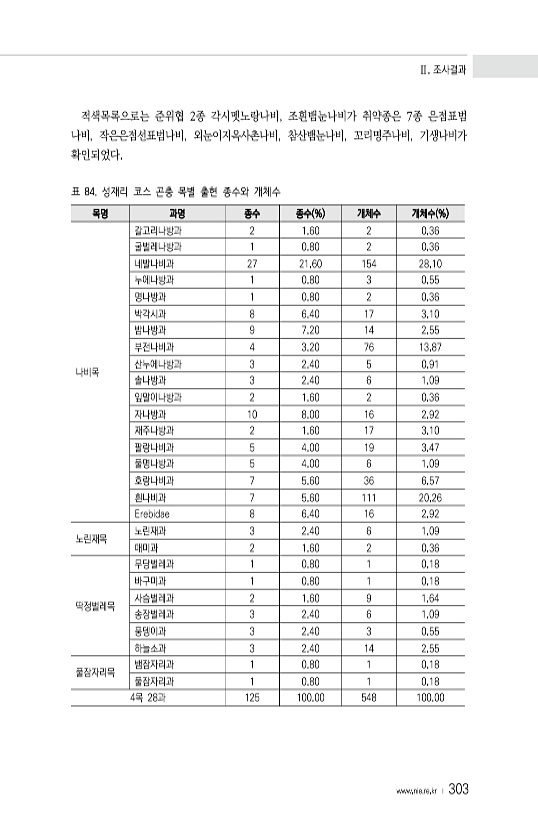 Ⅱ. 조사결과 www.nie.re.kr ? 303 적색목록으로는 준위협 2종 각시멧노랑나비, 조흰뱀눈나비가 취약종은 7종 은점표범 나비, 작은은점선표범나비, 외눈이지옥사촌나비, 참산뱀눈나비, 꼬리명주나비, 기생나비가 확인되었다. 표 84. 성재리 코스 곤충 목별 출현 종수와 개체수 목명 과명 종수 종수 % 개체수 개체수 % 나비목 갈고리나방과 2 1.60 2 0.36 굴벌레나방과 1 0.80 2 0.36 네발나비과 27 21.60 154 28.10 누에나방과 1 0.80 3 0.55 명나방과 1 0.80 2 0.36 박각시과 8 6.40 17 3.10 밤나방과 9 7.20 14 2.55 부전나비과 4 3.20 76 13.87 산누에나방과 3 2.40 5 0.91 솔나방과 3 2.40 6 1.09 잎말이나방과...