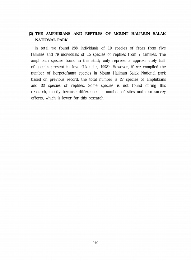 2 THE AMPHIBIANS AND REPTILES OF MOUNT HALIMUN SALAK NATIONAL PARK In total we found 288 individuals of 19 species of frogs from five families and 79 individuals of 15 species of reptiles from 7 families. The amphibian species found in this study only represents approximately half of species present in Java Iskandar, 1998 However, if we compiled the number of herpetofauna species in Mount Halimun ...
