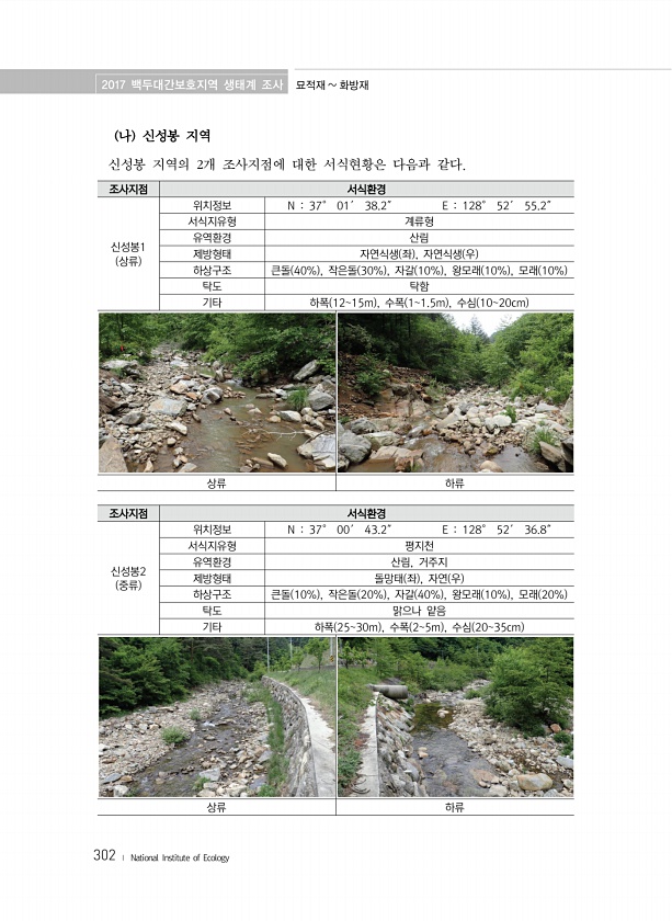 2017 백두대간보호지역 생태계 조사 묘적재 화방재 302 ? National Institute of Ecology 나 신성봉 지역 신성봉 지역의 2개 조사지점에 대한 서식현황은 다음과 같다. 조사지점 서식환경 신성봉1 상류 위치정보 N 37° 01′ 38.2″ E 128° 52′ 55.2″ 서식지유형 계류형 유역환경 산림 제방형태 자연식생 좌 , 자연식생 우 하상구조 큰돌 40% , 작은돌 30% , 자갈 10% , 왕모래 10% , 모래 10% 탁도 탁함 기타 하폭 1215m , 수폭 11.5m , 수심 1020cm 상류 하류 조사지점 서식환경 신성봉2 중류 위치정보 N 37° 00′ 43.2″ E 128° 52′ 36.8″ 서식지유형 평지천 유역환경 산림, 거주지 제방형태 돌망태 좌 , 자연 우 하상구...