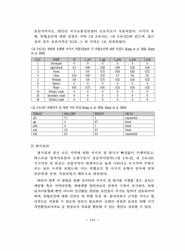 643 보전지역지도, 2011년 국가교통정보센터 도로지도가 사용되었다. 서식지 유 형, 위협요인에 대한 설정은 이하 표 2-6-51 , 표 2-6-52 와 같으며, 접근 성의 경우 보호지역은 0.2로 그 외 지역은 1로 설정하였다. LULC NAME Hj L_urb L_agr L_prds L_srds L_trds 1 Developed 0 0 0 0 0 0 2 Agricultural 0.3 0.69 0.03 0.69 0.59 0.49 3 Forest 1 0.9 0.75 0.93 0.83 0.73 4 Grass 0.42 0.65 0.57 0.7 0.6 0.5 5 Wetland 0.8 0.8 0.75 0.55 0.45 0.35 6 Barren 0 0 0 0 0 0 7 Water 0.65 0.73 0.65 0.55...