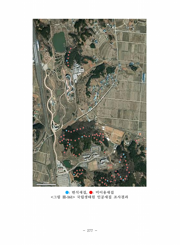 277 ●번식새집, ●미이용새집 그림 Ⅲ-161 국립생태원 인공새집조사결과