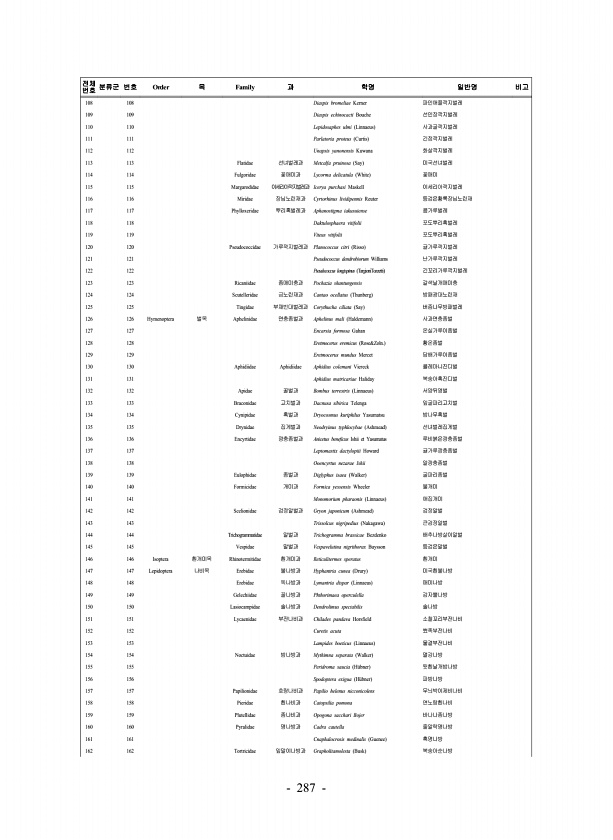 287 전체 번호 분류군 번호 Order 목 Family 과 학명 일반명 비고 108 108 Diaspis bromeliae Kerner 파인애플깍지벌레 109 109 Diaspis echinocacti Bouche 선인장깍지벌레 110 110 Lepidosaphes ulmi Linnaeus 사과굴깍지벌레 111 111 Parlatoria proteus Curtis 긴점깍지벌레 112 112 Unapsis yanonensis Kuwana 화살깍지벌레 113 113 Flatidae 선녀벌레과 Metcalfa pruinosa Say 미국선녀벌레 114 114 Fulgoridae 꽃매미과 Lycorma delicatula White 꽃매미 115 115 Margarodidae 이세리아깍지벌레과 Icerya pur...