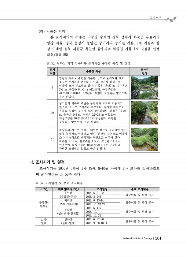담 수 어 류 National Institute of EcologyⅠ301 소구간 대표산 조사구간 조사일정 주요 조사내용 추풍령형제봉 웅이산 추풍령큰재 2016. 6. 2122 담수어류 및 환경 조사 2016. 8. 23 백학산 큰재신의터재 2016. 6. 1314 담수어류 및 환경 조사 2016. 10. 2425 봉황산 신의터재형제봉 2016. 6. 46 2016. 10. 1 담수어류 및 환경 조사 2016. 10. 24 늘재밀재 청화산 늘재밀재 2016. 6. 2728 담수어류 및 환경 조사 2016. 9. 3010. 1 표 56. 조사일정 및 주요 조사내용 라 청화산 지역 본 조사지역의 수계는 낙동강 수계인 경북 상주시 화북면 용유리의 영강 지류, 경북 문경시 농암면 궁기리의 궁기천 지류, 2개 지점과...