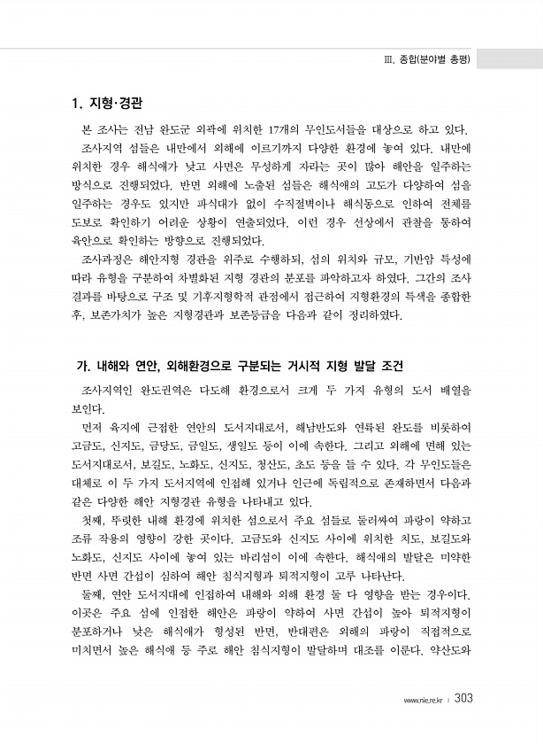 Ⅲ. 종합 분야별 총평 www.nie.re.kr ? 303 1. 지형·경관 본 조사는 전남 완도군 외곽에 위치한 17개의 무인도서들을 대상으로 하고 있다. 조사지역 섬들은 내만에서 외해에 이르기까지 다양한 환경에 놓여 있다. 내만에 위치한 경우 해식애가 낮고 사면은 무성하게 자라는 곳이 많아 해안을 일주하는 방식으로 진행되었다. 반면 외해에 노출된 섬들은 해식애의 고도가 다양하여 섬을 일주하는 경우도 있지만 파식대가 없이 수직절벽이나 해식동으로 인하여 전체를 도보로 확인하기 어려운 상황이 연출되었다. 이런 경우 선상에서 관찰을 통하여 육안으로 확인하는 방향으로 진행되었다. 조사과정은 해안지형 경관을 위주로 수행하되, 섬의 위치와 규모, 기반암 특성에 따라 유형을 구분하여 차별화된 지형 경관의 분포를 파악하고...