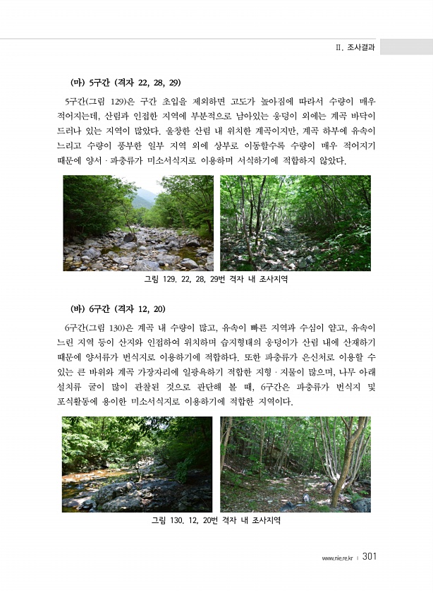 Ⅱ. 조사결과 www.nie.re.kr ? 301 마 5구간 격자 22, 28, 29 5구간 그림 129 은 구간 초입을 제외하면 고도가 높아짐에 따라서 수량이 매우 적어지는데, 산림과 인접한 지역에 부분적으로 남아있는 웅덩이 외에는 계곡 바닥이 드러나 있는 지역이 많았다. 울창한 산림 내 위치한 계곡이지만, 계곡 하부에 유속이 느리고 수량이 풍부한 일부 지역 외에 상부로 이동할수록 수량이 매우 적어지기 때문에 양서ㆍ파충류가 미소서식지로 이용하며 서식하기에 적합하지 않았다. 그림 129. 22, 28, 29번 격자 내 조사지역 바 6구간 격자 12, 20 6구간 그림 130 은 계곡 내 수량이 많고, 유속이 빠른 지역과 수심이 얕고, 유속이 느린 지역 등이 산지와 인접하여 위치하며 습지형태의 웅덩이가 산림 ...