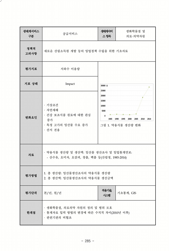 285 생태계서비스 구분 공급서비스 생태계서비 스 항목 생화학물질 의료·의약자원및 정책적 고려사항 새로운 산림소득원 개발 등의 임업정책 수립을 위한 기초자료 평가지표 지하수 이용량 그림 1. 약용식물 생산량 변화 지표 상태 Impact 변화요인 · 기상조건 · 자연재해 · 건강 보조식품 원료에 대한 관심 증가 · 특정 고가의 임산물 수요 증가 · 산지 전용 자료 · 약용식물 생산량 및 생산액임산물 생산조사 및 임업통계연보산수유, 오미자, 오갈피, 창출, 백출 등 산림청, 1985-2014 평가방법 1. 총 생산량임산물생산조사의 약용식물 생산량 2. 총 생산액임산물생산조사의 약용식물 생산금액 평가단위 톤/년, 원/년 적용기술, 시스템 기초통계, GIS 한계점 · 생화학물질, 의료의약 자원의 정의 및 범위 모호...