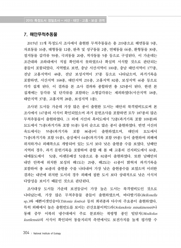 2015 특정도서 정밀조사 서산·태안·고흥·보성 권역 304 ? National Institute of Ecology 7. 해안무척추동물 2015년 11개 특정도서 조사에서 출현한 무척추동물은 총 219종으로 해면동물 9종, 자포동물 16종, 태형동물 12종, 완족 및 성구동물 2종, 연체동물 66종, 환형동물 30종, 절지동물 갑각류 59종, 극피동물 20종, 척삭동물 5종 등으로 구성된다. 이 가운데는 조간대와 조하대에서 직접 확인하지 못하였으나 확실히 서식할 것으로 판단되는 종들이 포함되었다. 지역별로 보면, 충남 서산지역이 100종, 충남 태안지역이 177종, 전남 고흥지역이 48종, 전남 보성지역이 37종 등으로 나타났으며, 과거기록을 포함하면, 서산지역 168종, 태안지역 231종, 고흥지역 82...