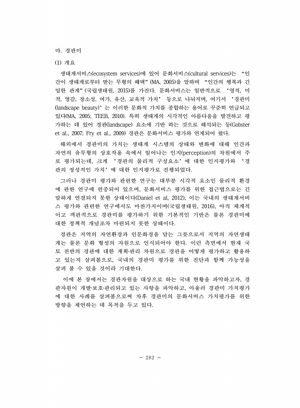 282 마. 경관미 1 개요 생태계서비스 ecosystem services 에 있어 문화서비스 cultural services 는 “인 간이 생태계로부터 받는 무형의 혜택” MA, 2005 을 말하며 “인간의 행복과 긴 밀한 관계” 국립생태원, 2015 를 가진다. 문화서비스는 일반적으로 ‘영적, 미 적, 영감, 장소성, 여가, 유산, 교육적 가치’ 등으로 나눠지며, 여기서 ‘경관미 landscape beauty ’는 이러한 문화적 가치를 종합하는 용어로 꾸준히 언급되고 있다 MA, 2005; TEEB, 2010 특히 생태계의 시각적인 아름다움을 발견하고 평 가하는 데 있어 경관 landscape 요소에 기반 하는 것으로 해석되는 등 Gobster et al., 2007; Fry et al., 2009 경관...
