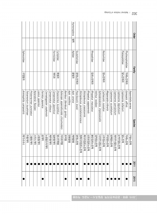 Ⅱ. 조사결과 www.nie.re.kr ? 303 학명 국명 문헌 현지조사 조사 A B C D E F G H 빙애 사동 덕현 시기 비고 골 덕산 리 산명 호 동송 토교 이길 리 Polistes yokahamae 등검정쌍살벌 ○ ○ Stenodynerus chinensis kalinowskiiS. chinensis kalinowskii 1 1 1 3 1 1d,2d Stenodynerus clypeopictus S. clypeopictus 1 1 1 1 6 6 1 1d,2d,3d Stenodynerus funebris S. funebris 1 1d Stenodynerus tergitus S. tergitus 1 2d Symmorphus carinatus 용골잎벌레살이감탕벌 1 1d Vespa analis par...