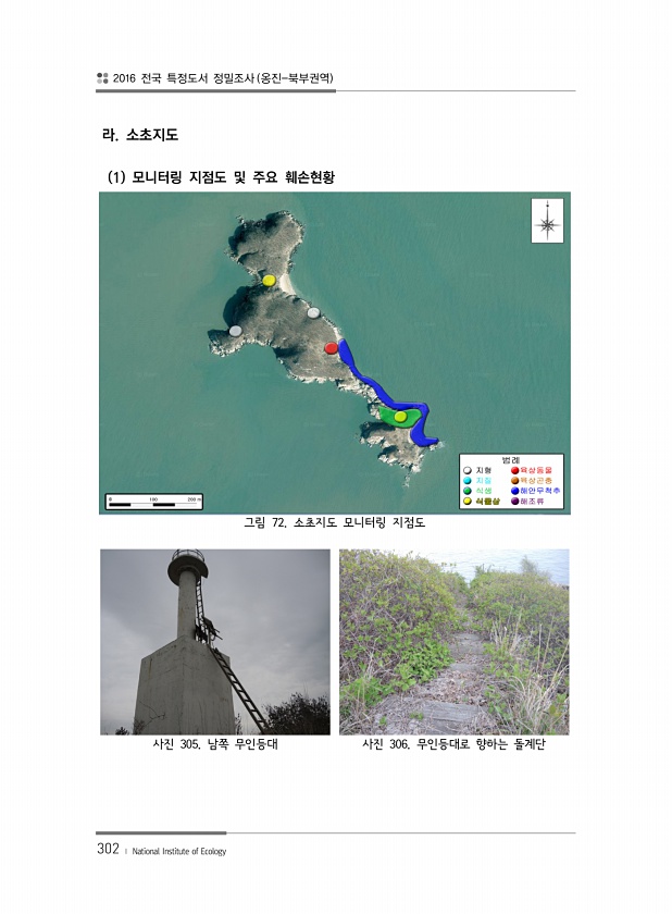 2016 전국 특정도서 정밀조사 옹진-북부권역 302 ? National Institute of Ecology 라. 소초지도 1 모니터링 지점도 및 주요 훼손현황 그림 72. 소초지도 모니터링 지점도 사진 305. 남쪽 무인등대 사진 306. 무인등대로 향하는돌계단