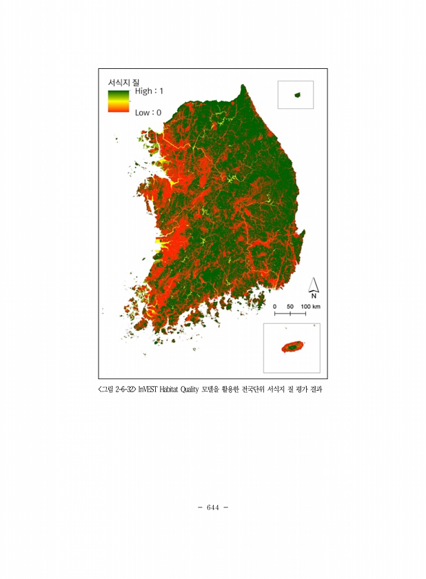 644 그림 2-6-32 InVEST Habitat Quality 모델을 활용한 전국단위 서식지 질 평가결과