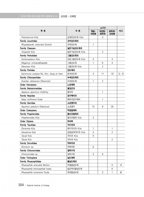 2018 백두대간보호지역 생태계 조사 삽당령 신배령 304 ? National Institute of Ecology 학 명 국 명 소구간 매봉비고 대관령 대관령닭목재 닭목재삽당령 Protonemura KUa 삼새민강도래 KUa 3 Family Leuctridae 꼬마강도래과 Rhopalopsole mahunkai Zwick 꼬마강도래 1 Family Claassen 넓은가슴강도래과 Yoraperla KUa 넓은가슴강도래 KUa 2 Family Perlodidae 그물강도래과 Archynopteryx KUa 큰등그물강도래 KUa 5 4 Megarcys ochraceaKlapalek 그물강도래 1 8 4 Stavsolus KUa 그물강도래 KUa 2 Family Perlidae 강도래과 Kamimuria cor...
