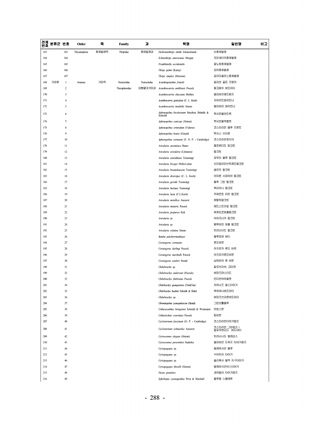 288 전체 번호 분류군 번호 Order 목 Family 과 학명 일반명 비고 163 163 Thysanoptera 총채벌레목 Thripidae 총채벌레과 Dichromothrips smithi Zimmermann 난총채벌레 164 164 Echinothrips americanus Morgan 포인세티아총채벌레 165 165 Frankliniella occidentalis 꽃노랑총채벌레 166 166 Thrips palmi Karny 오이총채벌레 167 167 Thrips simplex Morison 글라디올러스총채벌레 168 거미류 1 Araneae 거미목 Nemesiidae Nemesiidae Acanthogonathus francki 칠리안 골든 프랭키 169 2 Theraphosidae 대형열대거미과...
