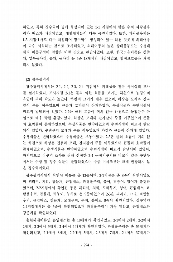 294 하였고, 특히 정수역이 넓게 형성되어 있는 1-1 지점에서 많은 수의 파랑볼우 럭과 배스가 채집되었고, 대형개체들이 다수 목견되었다. 또한, 파랑볼우럭은 1-3 지점에서도 다수 채집되어 정수역이 형성되어 있는 하천 곳곳에 외래어종 이 다수 서식하는 것으로 조사되었고, 외래어종의 높은 상대풍부도는 수생태 계의 어종구성에 영향을 미칠 것으로 판단되었다. 또한, 한국고유어종은 참종 개, 얼룩동사리, 몰개, 동사리 등 4종 18개체만 채집되었고, 법정보호종은 채집 되지 않았다. 2 광주광역시 광주광역시에서는 2-1, 2-2, 2-3, 2-4 지점에서 외래생물 전국 서식실태 조사 를 실시하였다. 조사지점 2-1은 물의 약한 흐름을 보이는 하천으로 농경수의 유입에 의해 탁도가 높았다. 하천의 크기가 매우 컸으며...
