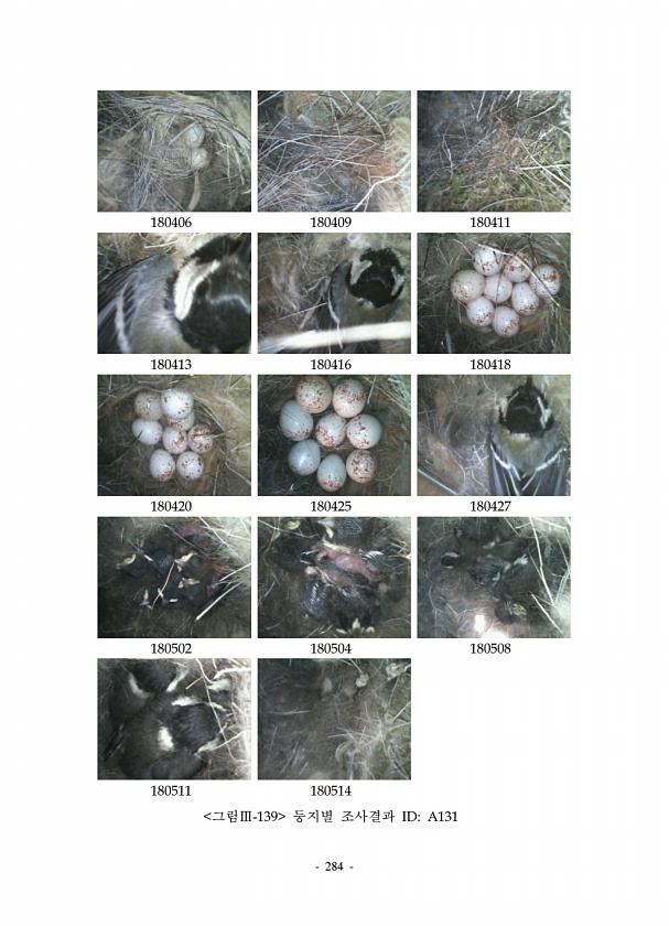 284 180406 180409 180411 180413 180416 180418 180420 180425 180427 180502 180504 180508 180511 180514 그림Ⅲ-139 둥지별 조사결과 IDA131