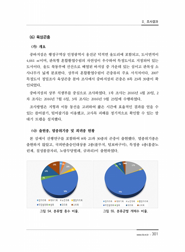 Ⅱ. 조사결과 www.nie.re.kr ? 301 6 육상곤충 가 개요 중바지섬은 행정구역상 인청광역시 옹진군 덕적면 울도리에 포함되고, 도서면적이 4,661 ㎡이며, 관목형 혼합활엽수림의 자연성이 우수하여 특정도서로 지정되어 있는 도서이다. 울도 북동부에 선산으로 배열된 바지섬 중 가운데 있는 섬이고 관목성 소 사나무가 넓게 분포한다. 상부의 혼합활엽수림이 곤충류의 주요 서식처이다. 2007 특정도서 정밀조사 육상곤충 분야 조사에서 중바지섬의 곤충은 8목 23과 39종이 확 인되었다. 중바지섬의 상부 식생부를 중심으로 조사하였다. 1차 조사는 2016년 4월 20일, 2 차 조사는 2016년 7월 6일, 3차 조사는 2016년 9월 23일에 수행하였다. 조사방법은 지형과 이동 동선을 고려하여 짧은 시간에 ...