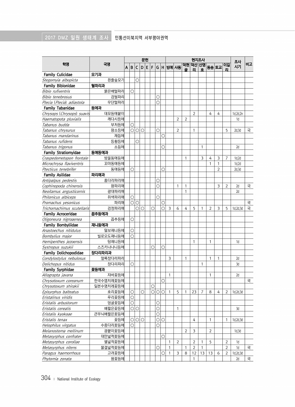 2017 DMZ 일원 생태계 조사 민통선이북지역 서부평야권역 304 ? National Institute of Ecology 학명 국명 문헌 현지조사 조사 A B C D E F G H 빙애 사동 덕현 시기 비고 골 덕산 리 산명 호 동송 토교 이길 리 Family Culicidae 모기과 Stegomyia albopicta 흰줄숲모기 ○ Family Bibionidae 털파리과 Bibio rufiventris 붉은배털파리 ○ Bibio tenebrosus 검털파리 ○ Plecia Plecia adiastola 우단털파리 ○ Family Tabanidae 등에과 Chrysops Chrysops suavis 대모등에붙이 2 4 4 1d,2d,2n Haematopota pluvialis 깨다시등에 2 2 1d T...