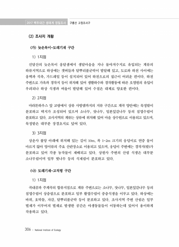 2017 백두대간 생태계 정밀조사 구룡산 고정조사구 306 ? National Institute of Ecology 2 조사지 개황 가 늦은목이도래기재 구간 1 1지점 선달산의 늦은목이 옹달샘에서 생달마을을 지나 물야저수지로 유입되는 계류의 하류지역으로 하상에는 갯버들과 달뿌리풀군락이 발달해 있고, 도로와 하천 사이에는 옹벽과 석축, 가드레일 등이 설치되어 있어 하천으로의 접근이 어려운 편이다. 하천 주변으로 가옥과 경작지 등이 위치해 있어 생활하수와 경작활동에 따른 오염원의 유입이 우려되나 하상 식생과 여울이 발달해 있어 수질은 대체로 양호한 편이다. 2 2지점 마라톤하우스 앞 교량에서 상류 사방댐까지의 지류 구간으로 계곡 양안에는 묵정밭이 분포하고 택지가 조성되어 있으며 소나무, 잣나무, 일본잎갈나무 등...