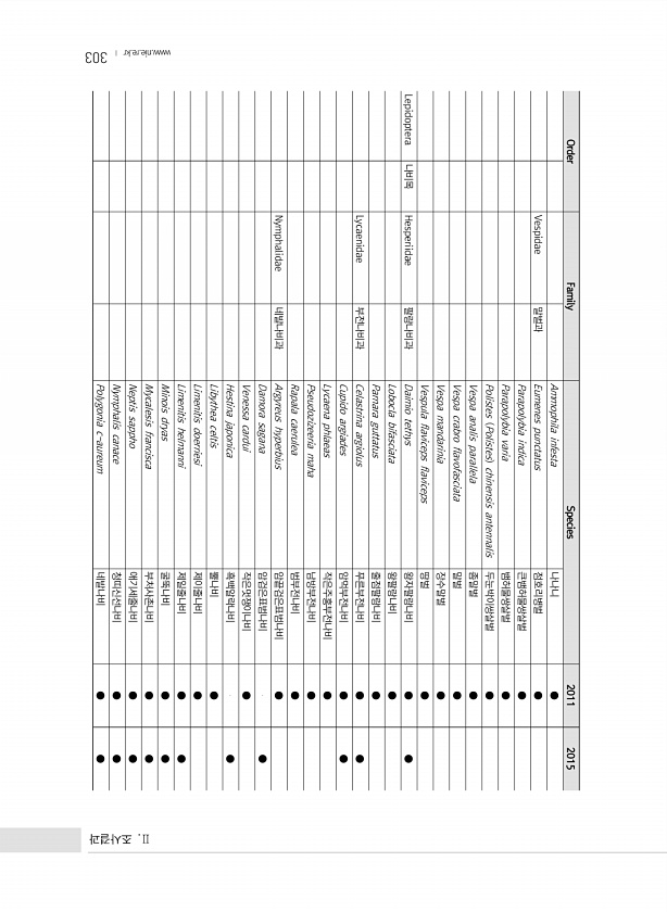 303 Order Family Species 2011 2015 Ammophila infesta 나나니 ● Vespidae 말벌과 Eumenes punctatus 점호리병벌 ● Parapolybia indica 큰뱀허물쌍살벌 ● Parapolybia varia 뱀허물쌍살벌 ● Polistes Polistes chinensis antennalis 두눈박이쌍살벌 ● Vespa analis parallela 좀말벌 ● Vespa crabro flavofasciata 말벌 ● Vespa mandarinia 장수말벌 ● Vespula flaviceps flaviceps 땅벌 ● Lepidoptera 나비목 Hesperiidae 팔랑나비과 Daimio tethys 왕자팔랑나비 ● ● Lobocla bifasciata 왕...