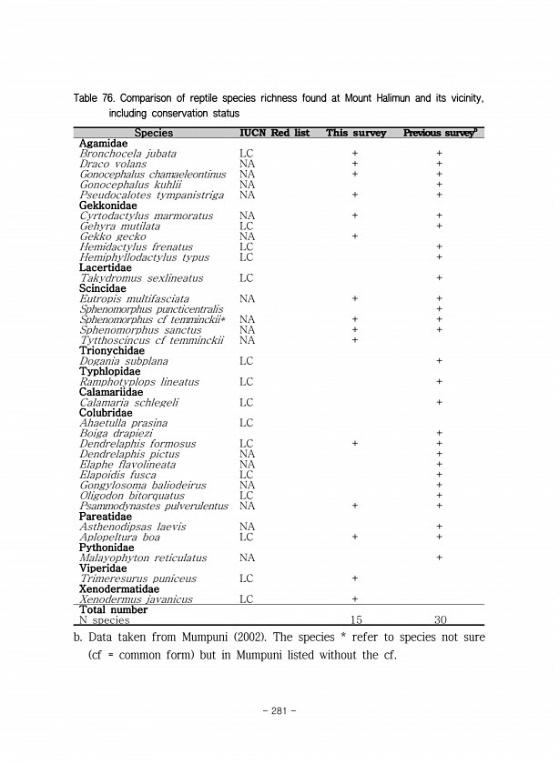 Species IUCN Red list This survey Previous surveyb Agamidae Bronchocela jubata LC + + Draco volans NA + + Gonocephalus chamaeleontinus NA + + Gonocephalus kuhlii NA + Pseudocalotes tympanistriga NA + + Gekkonidae Cyrtodactylus marmoratus NA + + Gehyra mutilata LC + Gekko gecko NA + Hemidactylus frenatus LC + Hemiphyllodactylus typus LC + Lacertidae Takydromus sexlineatus LC + Scincidae Eutropis mu...