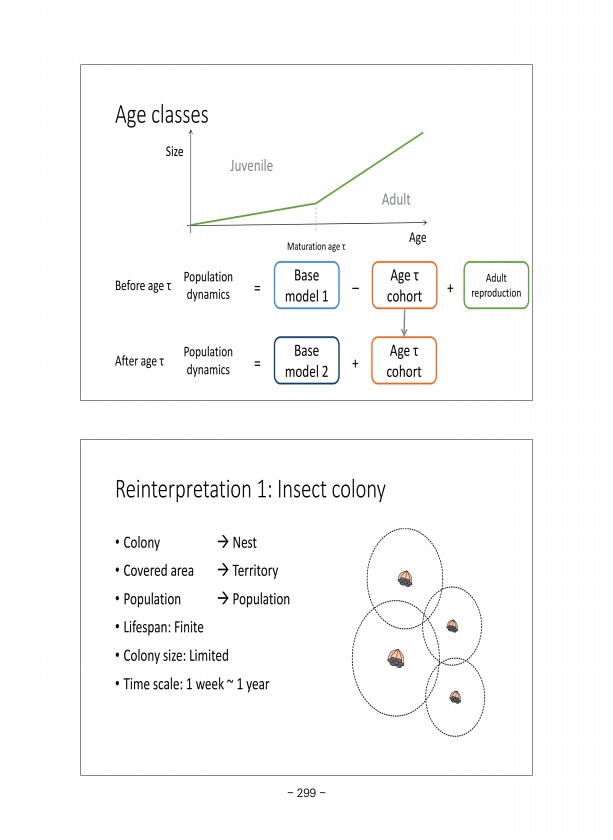 Reinterpretation 1Insect colony ? Colony ? Nest ? Covered area ? Territory ? Population ? Population ? LifespanFinite ? Colony sizeLimited ? Time scale1 week 1 year Age classes Size Age Maturation age τ Population dynamics Base model 1 Age τ = ? cohort Population dynamics Age τ = cohort Base model 2 Before age τ After age τ + Juvenile Adult Adult + reproduction 299