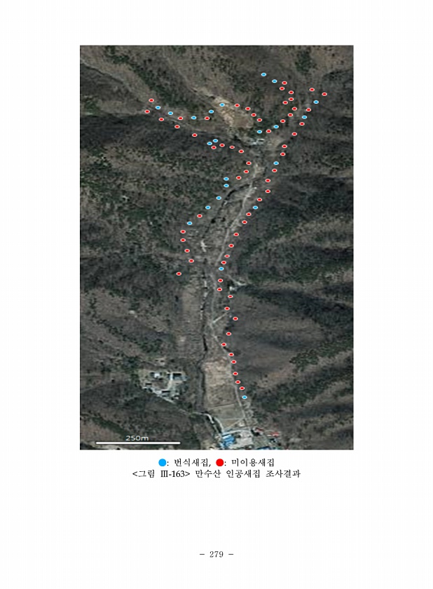 279 ●번식새집, ●미이용새집 그림 Ⅲ-163 만수산 인공새집조사결과