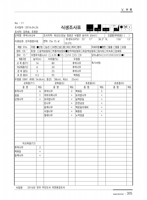 Ⅴ. 부 록 www.nie.re.kr ? 305 No 11 조사일자 2016.04.26 조사자김하송, 조영준 식생조사표 군락명후박나무군락 조사지역육산도 전남 영광군 낙월면 송이리 산441 도엽명 격자번호 식생상관산지침엽수림 면적15x 15 ㎡ 위?경도 GPS 35° 17′ 36.3″N, 126° 12′ 10.9E 해발97m 지형■산정 □능선 □사면 □상□중□하 □계곡□평지 미세지형■평면 □돌출 □함몰 □요철 방위135 ° 토양□갈색삼림토□적황색삼림토■암적색삼림토□회갈색삼림토□침식토□미숙토□암쇄토 경사15 ° 낙엽부식층 cm □.≥20 ■ 15 □ 10 □ 5 □0 암석노출 % □≥51□ 50□ 25□ 5■0 계층구분 높이 m 식피율 % 우점종 교 목 층 T1 14 80 후박나무 특기사항아교목층 T2 6 20...