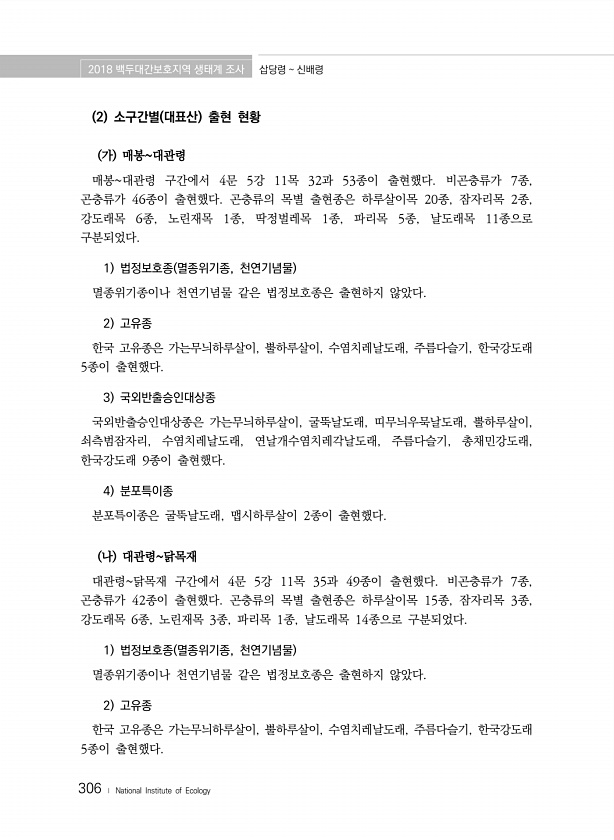 2018 백두대간보호지역 생태계 조사 삽당령 신배령 306 ? National Institute of Ecology 2 소구간별 대표산 출현 현황 가 매봉대관령 매봉대관령 구간에서 4문 5강 11목 32과 53종이 출현했다. 비곤충류가 7종, 곤충류가 46종이 출현했다. 곤충류의 목별 출현종은 하루살이목 20종, 잠자리목 2종, 강도래목 6종, 노린재목 1종, 딱정벌레목 1종, 파리목 5종, 날도래목 11종으로 구분되었다. 1 법정보호종 멸종위기종, 천연기념물 멸종위기종이나 천연기념물 같은 법정보호종은 출현하지 않았다. 2 고유종 한국 고유종은 가는무늬하루살이, 뿔하루살이, 수염치레날도래, 주름다슬기, 한국강도래 5종이 출현했다. 3 국외반출승인대상종 국외반출승인대상종은 가는무늬하루살이, 굴뚝날도래, 띠무늬...
