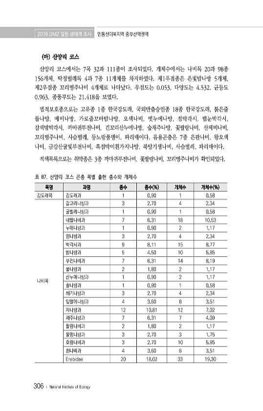 2018 DMZ 일원 생태계 조사 민통선이북지역 중부산악권역 306 ? National Institute of Ecology 목명 과명 종수 종수 % 개체수 개체수 % 강도래목 강도래과 1 0.90 1 0.58 나비목 갈고리나방과 3 2.70 4 2.34 굴벌레나방과 1 0.90 1 0.58 네발나비과 7 6.31 18 10.53 누에나방과 1 0.90 2 1.17 명나방과 3 2.70 4 2.34 박각시과 9 8.11 15 8.77 밤나방과 5 4.50 10 5.85 부전나비과 7 6.31 14 8.19 불나방과 2 1.80 2 1.17 산누에나방과 1 0.90 2 1.17 솔나방과 1 0.90 1 0.58 쐐기나방과 3 2.70 4 2.34 잎말이나방과 4 3.60 6 3.51 자나방과 12 10.81 ...
