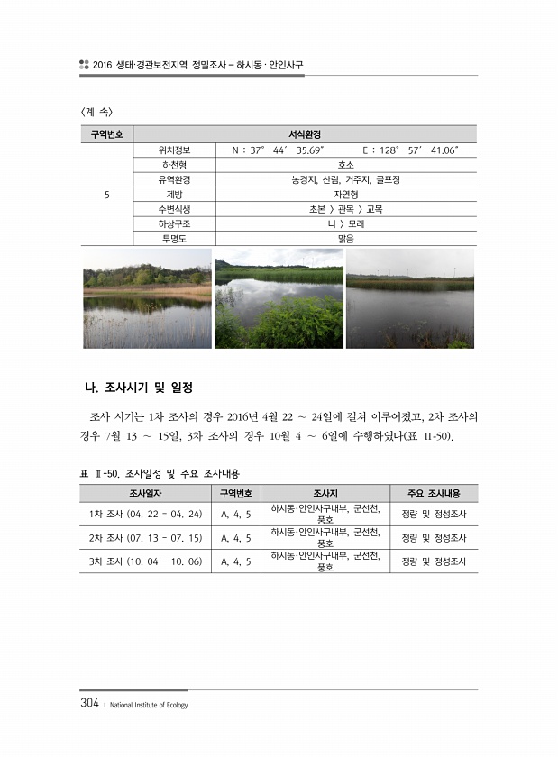 2016 생태·경관보전지역 정밀조사 하시동 · 안인사구 304 ? National Institute of Ecology 구역번호 서식환경 5 위치정보 N 37° 44′ 35.69″ E 128° 57′ 41.06″ 하천형 호소 유역환경 농경지, 산림, 거주지, 골프장 제방 자연형 수변식생 초본 관목 교목 하상구조 니 모래 투명도 맑음 계 속 나. 조사시기 및 일정 조사 시기는 1차 조사의 경우 2016년 4월 22 ∼ 24일에 걸쳐 이루어졌고, 2차 조사의 경우 7월 13 ∼ 15일, 3차 조사의 경우 10월 4 ∼ 6일에 수행하였다 표 Ⅱ-50 표 Ⅱ-50. 조사일정 및 주요 조사내용 조사일자 구역번호 조사지 주요 조사내용 1차 조사 04. 22 ? 04. 24 A, 4, 5 하시동·안인사구내부, 군선천, ...