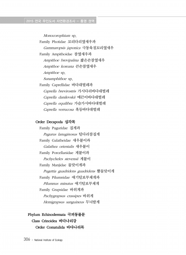 2015 전국 무인도서 자연환경조사 통영 권역 306 ? National Institute of Ecology Monocorophium sp. Family Photidae 꼬리다리옆새우과 Gammaropsis japonica 극동육질꼬리옆새우 Family Ampithoidae 참옆새우과 Ampithoe brevipalma 짧은손참옆새우 Ampithoe koreana 큰손참옆새우 Ampithoe sp. Sunamphithoe sp. Family Caprellidae 바다대벌레과 Caprella brevirostris 가시다리바다대벌레 Caprella danilevskii 매끈이바다대벌레 Caprella equilibra 가슴가시바다대벌레 Caprella verrucosa 혹등바다대벌레 Order Decapod...