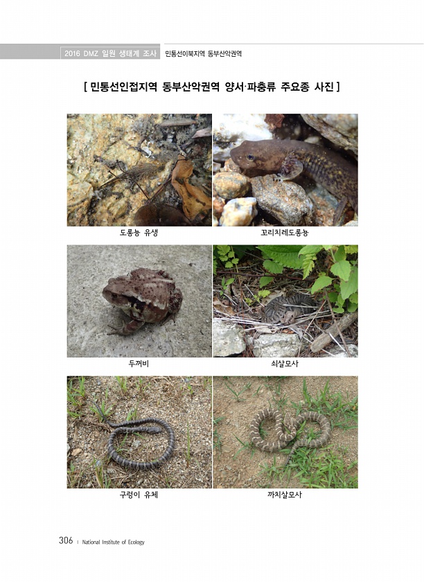2016 DMZ 일원 생태계 조사 민통선이북지역 동부산악권역 306 ? National Institute of Ecology [ 민통선인접지역 동부산악권역 양서·파충류 주요종 사진 ] 도롱뇽 유생 꼬리치레도롱뇽 두꺼비 쇠살모사 구렁이 유체까치살모사