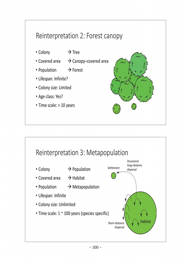 Reinterpretation 3Metapopulation ? Colony ? Population ? Covered area ? Habitat ? Population ? Metapopulation ? LifespanInfinite ? Colony sizeUnlimited ? Time scale1 100 years species specific Occasional long?distance dispersal Short?distance dispersal Habitat Settlement Reinterpretation 2Forest canopy ? Colony ? Tree ? Covered area ? Canopy?covered area ? Population ? Forest ? LifespanInfinite? ?...