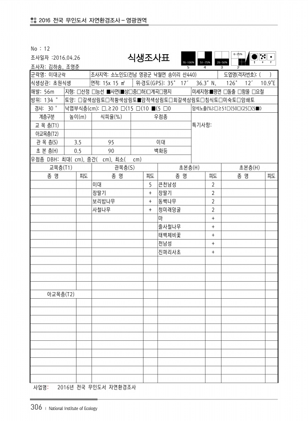 2016 전국 무인도서 자연환경조사 영광권역 306 ? National Institute of Ecology No 12 조사일자 2016.04.26 조사자김하송, 조영준 식생조사표 군락명이대군락 조사지역소노인도 전남 영광군 낙월면 송이리 산440 도엽명 격자번호 식생상관초원식생 면적15x 15 ㎡ 위?경도 GPS 35° 17′ 36.3″N, 126° 12′ 10.9E 해발56m 지형□산정 □능선 ■사면 ■상□중□하 □계곡□평지 미세지형■평면 □돌출 □함몰 □요철 방위134 ° 토양□갈색삼림토□적황색삼림토■암적색삼림토□회갈색삼림토□침식토□미숙토□암쇄토 경사30 ° 낙엽부식층 cm □.≥20 □ 15 □ 10 ■ 5 □0 암석노출 % □≥51□ 50□ 25□ 5■0 계층구분 높이 m 식피율 % 우점종 교 목 층...