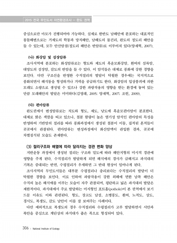 2015 전국 무인도서 자연환경조사 완도 권역 306 ? National Institute of Ecology 중심으로만 마모가 진행되어야 가능하다. 실제로 한반도 남해안에 분포하는 대표적인 몽돌해변으로는 거제도의 학동과 망치해안, 남해도의 물건리, 완도의 정도리 해안을 들 수 있는데, 모두 안산암질 정도리 해안은 반암류 로 이루어져 있다 양재혁, 2007 나 화강암 및 섬장암류 조사지역에 분포하는 화성암류로는 형도와 제도의 흑운모화강암, 흰여의 섬록암, 대망도의 섬장암, 갈도의 반암을 들 수 있다. 이 암석들은 대체로 풍화에 강한 경향을 보인다. 다만 구조선을 반영한 수직절리의 발달이 탁월한 경우에는 국지적으로 풍화되면서 해식동을 형성하거나 거력을 공급하기도 한다. 화강암의 입상붕괴에 의한 모래도 소량으로...