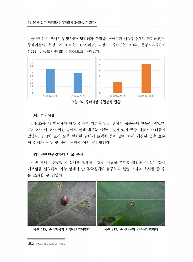 2016 전국 특정도서 정밀조사 옹진-남부권역 302 ? National Institute of Ecology 중바지섬은 조사시 밤빛사촌썩덩벌레가 우점종, 참매미가 아우점종으로 출현하였다. 중바지섬의 우점도지수 DI 는 0.723이며, 다양도지수 H는 2.042, 풍부도지수 RI 5.222, 균등도지수 EI 0.6004으로 나타났다. 그림 56. 중바지섬 군집분석 현황. 다 특기사항 1차 조사 시 일교차가 매우 심하고 기온이 낮은 편이서 곤충들의 활동이 적었고, 2차 조사 시 조사 직전 장마로 인해 대부분 식물이 젖어 있어 곤충 채집에 어려움이 있었다. 2, 3차 조사 모두 설치한 깔대기 트랩에 물이 많이 차서 채집된 곤충 표본 의 상태가 매우 안 좋아 동정에 어려움이 있었다. 라 선행연구결과와 비교 분석 ...
