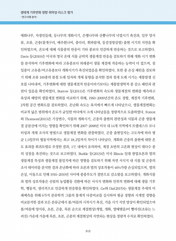 312 생태계 기후변화 영향·취약성·리스크 평가 -연구사례 분석- 매화나무, 자생민들레, 등나무의 개화시기, 은행나무와 산뽕나무의 낙엽시기 촉진과, 일부 양서 류, 조류, 곤충 참개구리, 배추흰나비, 종다리, 휘파람새, 등검정쌍살벌 출현 시기의 지연을 확 인하였으며, 온도에 대해 식물종의 반응이 기타 종보다 민감하게 반응하는 것으로 보고하였다. Davis 등 2010 은 미국과 영국 온대 식물 군락의 생물계절 반응을 검토하기 위해 개화 시기 변화 를 분석하여 기후변화에 따라 고유종보다 외래종이 생물 계절에 적응하는 능력이 더 컸으며, 침 입종이 고유종/비고유종보다 개화시기가 촉진되었음을 확인하였다. 또한 종 손실 패턴을 검토하 기 위해 조류 100종의 봄철 도래 일자와 개체 동향을 분석한 결과 철새 도래 시...