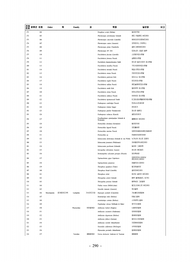290 전체 번호 분류군 번호 Order 목 Family 과 학명 일반명 비고 271 104 Paraphysa scrofa Molina 칠리안쿠퍼 272 105 Phormictopus atrichomatus Schmidt 레드 아일랜드 버드이터 273 106 Phormictopus cancerides Latreille 헤이티안브라운버드이터 274 107 Phormictopus cautus Ausserer 포믹토푸스 카우투스 275 108 Phormictopus platus Chamberlin 골든그레이버드이터 276 109 Phormictopus SP. D.R 도미니칸 스틸리 블루 277 110 Poecilotheria fasciata Latreille 스리랑카오너멘탈 278 111 Poecilotheria...