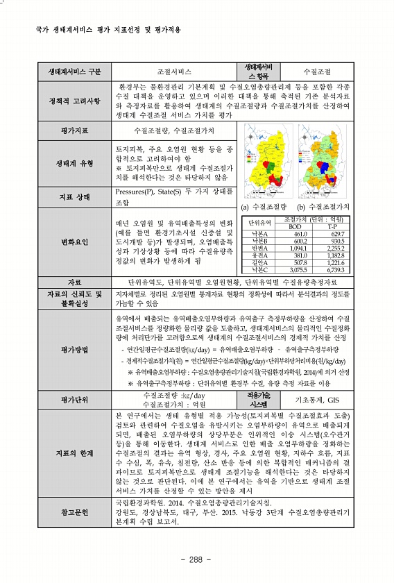 국가 생태계서비스 평가 지표선정 및 평가적용 288 생태계서비스 구분 조절서비스 생태계서비 스 항목 수질조절 정책적 고려사항 환경부는 물환경관리 기본계획 및 수질오염총량관리제 등을 포함한 각종 수질 대책을 운영하고 있으며 이러한 대책을 통해 축적된 기존 분석자료 와 측정자료를 활용하여 생태계의 수질조절량과 수질조절가치를 산정하여 생태계 수질조절 서비스 가치를 평가 평가지표 수질조절량, 수질조절가치 a 수질조절량 b 수질조절가치 단위유역 조절가치 단위 억원 BOD T-P 낙본A 461.0 629.7 낙본B 600.2 930.5 반변A 1,094.1 2,255.2 용전A 381.0 1,182.8 길안A 507.8 1,221.6 낙본C 3,075.5 6,739.3 생태계 유형 토지피복, 주요 오염원 현황 등을 종...