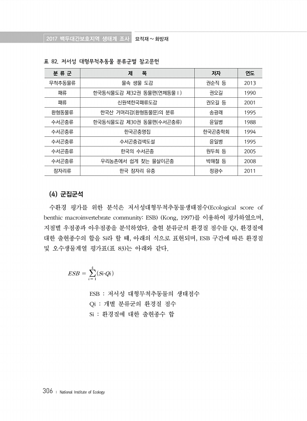 2017 백두대간보호지역 생태계 조사 묘적재 화방재 306 ? National Institute of Ecology 표 82. 저서성 대형무척추동물 분류군별 참고문헌 분 류 군 제 목 저자 연도 무척추동물류 물속 생물 도감 권순직 등 2013 패류 한국동식물도감 제32권 동물편 연체동물Ⅰ 권오길 1990 패류 신원색한국패류도감 권오길 등 2001 환형동물류 한국산 거머리강 환형동물문 의 분류 송광래 1995 수서곤충류 한국동식물도감 제30권 동물편 수서곤충류 윤일병 1988 수서곤충류 한국곤충명집 한국곤충학회 1994 수서곤충류 수서곤충검색도설 윤일병 1995 수서곤충류 한국의 수서곤충 원두희 등 2005 수서곤충류 우리농촌에서 쉽게 찾는 물살이곤충 박해철 등 2008 잠자리류 한국 잠자리 유충 정광수 20...