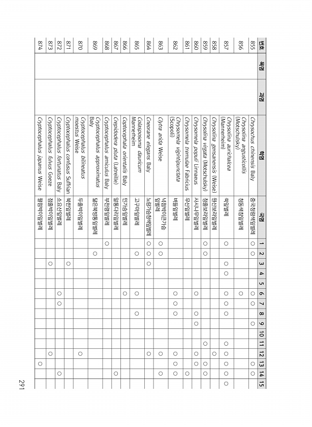 291 번호 목명 과명 학명 국명 1 2 3 4 5 6 7 8 9 10 11 12 13 14 15 855 Chrysochus chinensis Baly 중국청람색잎벌레 ○ ○ ○ ○ ○ ○ ○ 856 Chrysolina angusticollis Motschulsky 청동색참잎벌레 ○ 857 Chrysolina aurichalcea Mannerheim 쑥잎벌레 ○ ○ ○ ○ ○ ○ ○ ○ ○ ○ ○ 858 Chrysolina gensanensis Weise 원산보라잎벌레 ○ 859 Chrysolina virgata Motschulsky 청줄보라잎벌레 ○ ○ ○ ○ ○ 860 Chrysomela populi Linnaeus 사시나무잎벌레 ○ ○ ○ ○ ○ 861 Chrysomela tremulae Fabrici...
