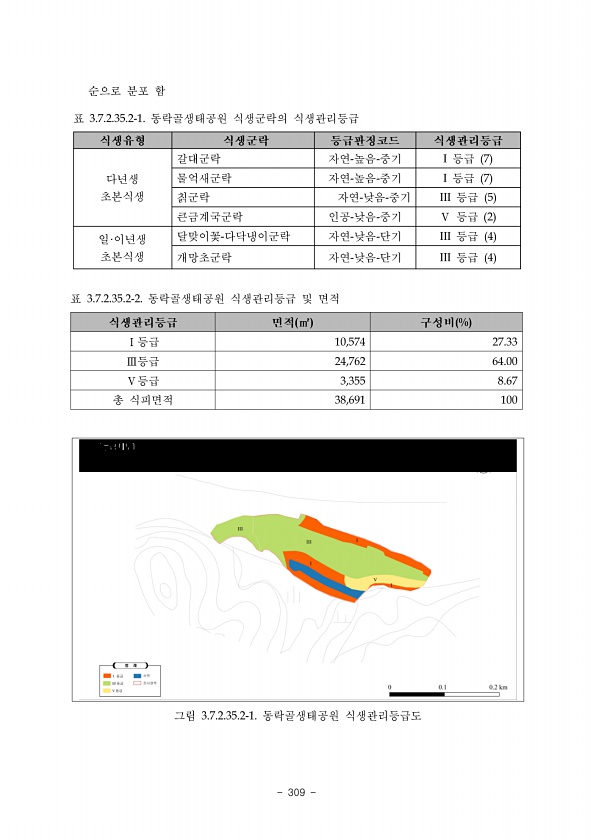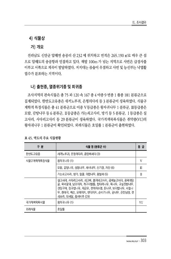 II. 조사결과 www.nie.re.kr ?303 4 전라남도 신안군 압해면 송공리 산 232 에 위치하고 면적은 265,190 ㎡로 매우 큰 섬 으로 압해도의 송공항과 인접하고 있다. 해발 100m 가 넘는 지역으로 사면은 급경사를 이루고 서쪽으로 계곡이 발달하였다. 저지대는 곰솔이 우점하고 사면 및 능선부는 낙엽활 엽수가 분포하는 지역이다. , 조사지역의 관속식물은 총 75 과 120 속 167 종 4 아종 9 변종 1 품종 181 분류군으로 집계되었다. 한반도고유종은 새끼노루귀, 은꿩의다리 등 3 분류군이 생육하였다. 식물구 계학적 특정식물은 총 41 분류군으로 이중 Ⅴ등급종은 왕자귀나무 1 분류군, Ⅲ등급종은 모람, 감탕나무 등 6 분류군, Ⅱ등급종은 가는쇠고사리, 방기 등 5 분류군, Ⅰ등급종은 실...