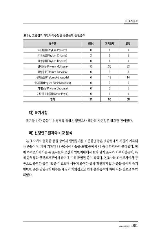 II. 조사결과 www.nie.re.kr ?301 분류군 본조사 과거조사 종합 해면동물 Phylum Porifera 0 1 1 자포동물 Phylum Cnidaria 2 6 6 태형동물 Phylum Bryozoa 0 1 1 연체동물 Phylum Mollusca 13 30 32 환형동물 Phylum Annelida 0 3 3 절지동물 Phylum Arthropoda 6 13 14 극피동물 Phyum Echinodermata 0 0 0 척삭동물 Phylum Chordata 0 0 0 기타 무척추동물 Orher Phyla 0 1 1 합계 21 55 58 표 58. 호감섬의 해안무척추동물 분류군별 출현종수 특기할 만한 종들이나 생태적 특성은 없었으나 해안의 자연성은 양호한 편이었다. 본 조사에서 출현한 종들 중에서 ...