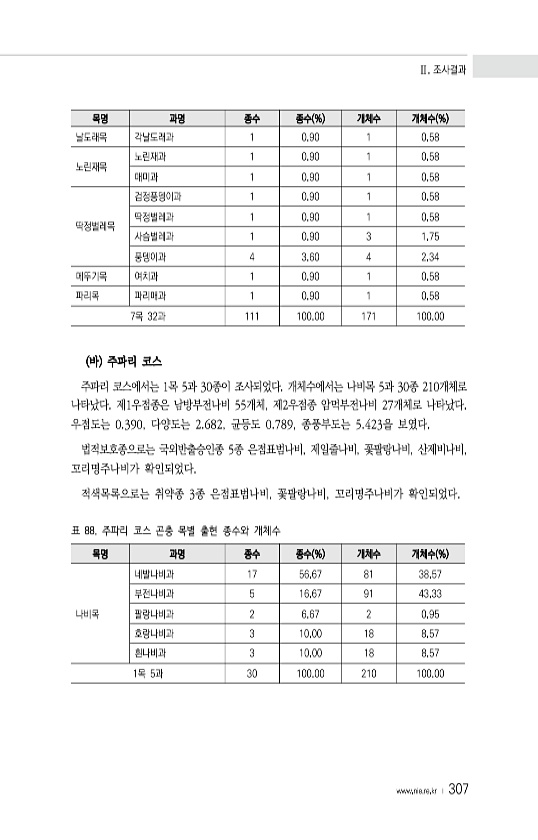 Ⅱ. 조사결과 www.nie.re.kr ? 307 목명 과명 종수 종수 % 개체수 개체수 % 날도래목 각날도래과 1 0.90 1 0.58 노린재목 노린재과 1 0.90 1 0.58 매미과 1 0.90 1 0.58 딱정벌레목 검정풍뎅이과 1 0.90 1 0.58 딱정벌레과 1 0.90 1 0.58 사슴벌레과 1 0.90 3 1.75 풍뎅이과 4 3.60 4 2.34 메뚜기목 여치과 1 0.90 1 0.58 파리목 파리매과 1 0.90 1 0.58 7목 32과 111 100.00 171 100.00 바 주파리 코스 주파리 코스에서는 1목 5과 30종이 조사되었다. 개체수에서는 나비목 5과 30종 210개체로 나타났다. 제1우점종은 남방부전나비 55개체, 제2우점종 암먹부전나비 27개체로 나타났다. 우점도는 0....