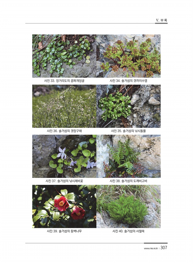 V. 부 록 www.nie.re.kr ?307 사진 33. 장거리도의 콩짜개덩굴 사진 34. 솔거섬의 갯까치수염 사진 36. 솔거섬의 갯장구채 사진 35. 솔거섬의 낚시돌풀 사진 37. 솔거섬의 낚시제비꽃 사진 38. 솔거섬의 도깨비고비 사진 39. 솔거섬의 동백나무 사진 40. 솔거섬의사철쑥