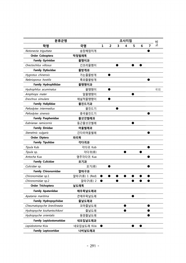 291 분류군명 조사지점 비 학명 국명 1 2 3 4 5 6 7 고 Notonecta triguttata 송장헤엄치게 ● Order Coleoptera 딱정벌레목 Family Gyrinidae 물맴이과 Orectochilus villosus 긴꼬리물맴이 ● ● ● Family Dytiscidae 물방개과 Hygrotus chinensis 가는줄물방개 ● Nebrioporus hostilis 혹외줄물방개 ● Family Hydrophilidae 물땡땡이과 Hydrophilus acuminatus 물땡땡이 ● 국외 Amphiops mater 알물땡땡이 ● Enochrus simulans 애넓적물땡땡이 ● Family Haliplidae 물진드기과 Peltodytes intermedius 물진드기 ● Peltod...
