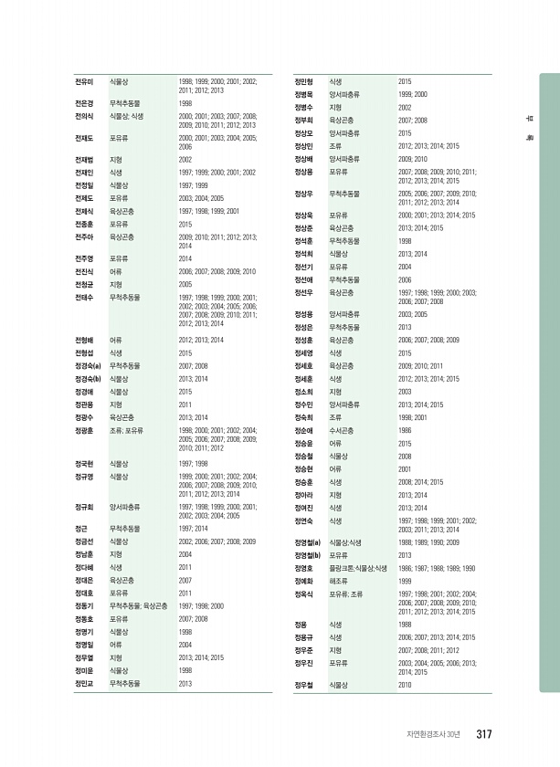 전유미 식물상 1998; 1999; 2000; 2001; 2002; 2011; 2012; 2013 전은경 무척추동물 1998 전의식 식물상; 식생 2000; 2001; 2003; 2007; 2008; 2009; 2010; 2011; 2012; 2013 전재도 포유류 2000; 2001; 2003; 2004; 2005; 2006 전재범 지형 2002 전재인 식생 1997; 1999; 2000; 2001; 2002 전정일 식물상 1997; 1999 전제도 포유류 2003; 2004; 2005 전제식 육상곤충 1997; 1998; 1999; 2001 전종훈 포유류 2015 전주아 육상곤충 2009; 2010; 2011; 2012; 2013; 2014 전주영 포유류 2014 전진식 어류 2006; 2007; 200...
