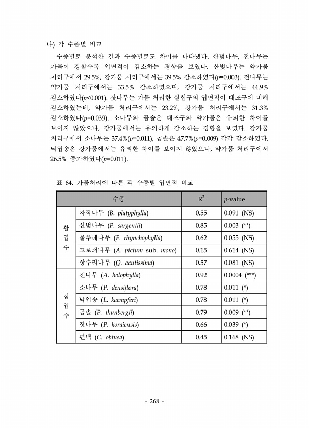 268 나 각 수종별 비교 수종별로 분석한 결과 수종별로도 차이를 나타냈다. 산벚나무, 전나무는 가뭄이 강할수록 엽면적이 감소하는 경향을 보였다. 산벚나무는 약가뭄 처리구에서 29.5%, 강가뭄 처리구에서는 39.5% 감소하였다 p=0.003 전나무는 약가뭄 처리구에서는 33.5% 감소하였으며, 강가뭄 처리구에서는 44.9% 감소하였다 p 0.001 잣나무는 가뭄 처리한 실험구의 엽면적이 대조구에 비해 감소하였는데, 약가뭄 처리구에서는 23.2%, 강가뭄 처리구에서는 31.3% 감소하였다 p=0.039 소나무와 곰솔은 대조구와 약가뭄은 유의한 차이를 보이지 않았으나, 강가뭄에서는 유의하게 감소하는 경향을 보였다. 강가뭄 처리구에서 소나무는 37.4% p=0.011 , 곰솔은 47.7% p=0.009 각각 감...