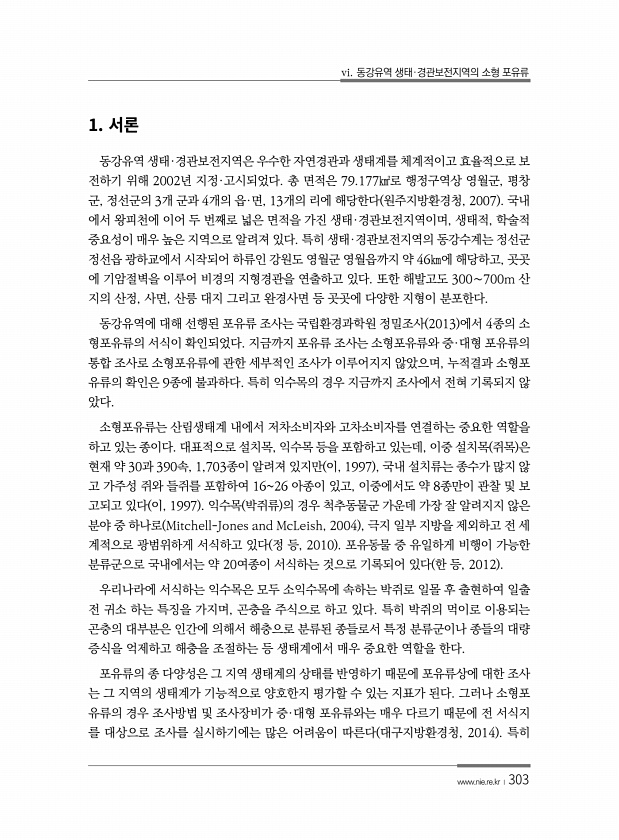 vi. 동강유역 생태·경관보전지역의 소형 포유류 www.nie.re.kr ?303 1. 동강유역 생태·경관보전지역은 우수한 자연경관과 생태계를 체계적이고 효율적으로 보 전하기 위해 2002년 지정·고시되었다. 총 면적은 79.177㎢로 행정구역상 영월군, 평창 군, 정선군의 3개 군과 4개의 읍·면, 13개의 리에 해당한다 원주지방환경청, 2007 국내 에서 왕피천에 이어 두 번째로 넓은 면적을 가진 생태·경관보전지역이며, 생태적, 학술적 중요성이 매우 높은 지역으로 알려져 있다. 특히 생태·경관보전지역의 동강수계는 정선군 정선읍 광하교에서 시작되어 하류인 강원도 영월군 영월읍까지 약 46㎞에 해당하고, 곳곳 에 기암절벽을 이루어 비경의 지형경관을 연출하고 있다. 또한 해발고도 300∼700m 산 지의 산정...
